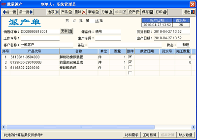根据销售订单或者自己编制的生产计划进行产品批量派产,自动生成投产零、部件明细,原材料、外购件需求明细以及工序外委加工明细等。